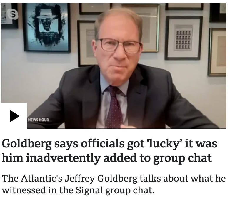 Sorry, Jeff (not that you’ll read this, because you, being the thin-skinned fellow you are, blocked me even following you on Twitter 14 years ago after I pointed out the many holes in your shabby case for America to go to war with Iran on Israel’s behalf)… Sorry, but no, they didn’t “get lucky” by adding you rather than some journalist who may have been less sympathetic to their strategy for dealing with Yemen to that WhatsApp chat ; you know very well why you were there. You’re a trusted Israel hack who can be relied on to do your bit in persuading liberals to support whatever new adventures the U.S. military is planning against Israel’s adversaries in the Middle East. Lines like “If they were going to pick an errant phone number, I mean at least it wasn't somebody who supported the Houthis” are some pretty puerile chaff, don’t you think? The reason they may have added you to the wrong group, but had you in mind and in their WhatsApps nonetheless, is because of your track record.
