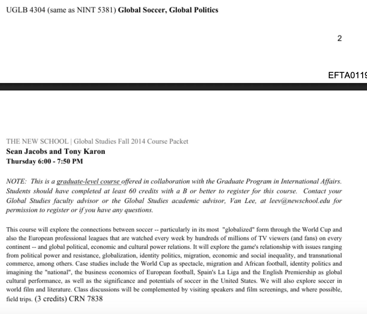Imagine our surprise when Sean Jacobs and I learned that the outline for the New School class we taught on the politics of global football made it into the Epstein files!